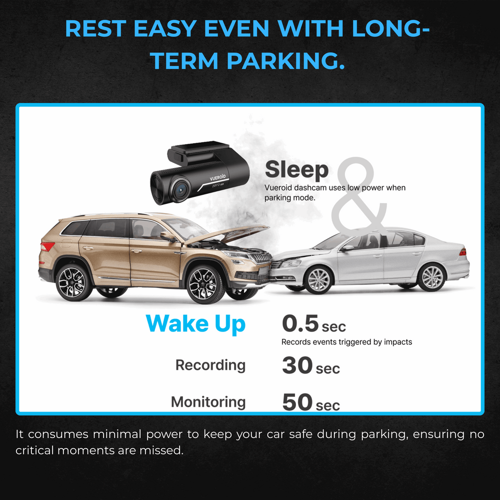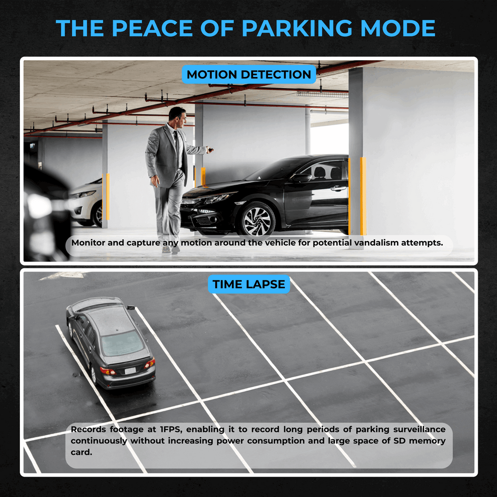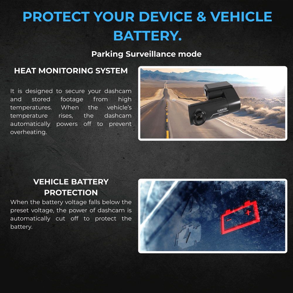 When the battery voltage falls below the preset voltage, the power of dashcam is automatically cut off to protect the battery.