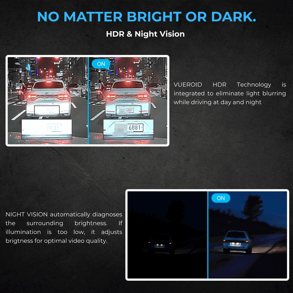 VUEROID HDR Technology is integrated to eliminate light blurring while driving at day and night, producing clear and vivid recordings even in challenging lighting conditions such as backlighting and in tunnels.