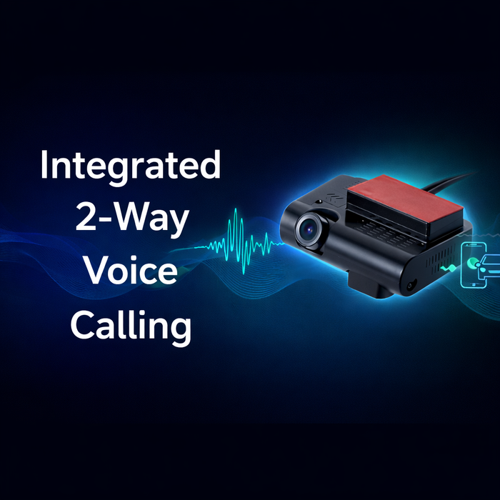 Black electronic device with red component on a dark blue background with text 'Integrated 2-Way Voice Calling'.